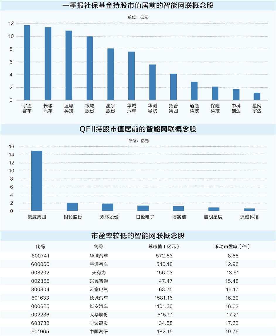 除社保基金外,QFII也青睐智能网联概念股。数据显示,共有14只概念股一季度末获QFII重仓,合计持股市值达到23.77亿元,豪威集团、银轮股份、双林股份、日盈电子、博实结获QFII一季度末持股市值均超过1亿元。